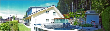 Eine Magnetic- Loop ist sehr schmalbandig und erfordert im Sendebetrieb auch bei geringsten Frequenzänderungen stets eine erneute Anpassung. Diese Aufgabe übernimmt komfortabel ein automatisches Steuergerät. Dieses liest über eine vorhandene CAT- Schnittstelle die aktuelle Frequenz aus dem Transceiver und passt die Loop dieser stets an. Diese - bei fehlender CAT- Schnittstelle auch manuell anzugehende Anpassung erfolgt über einen motorischen Antrieb, der den oben am Reif befindlichen PLattenkondensator entsprechend zusammen oder auseinander bewegt. Diese Antennenbauart (Ø ca. 0.8 Meter, Höhe mit Kondensator ca. 1m) hat neben der kompakten Bauweise den weiteren Vorteil, dass sich diese Antenne nahe am Boden befinden kann; ja sogar muss. Der ideale Bodenabstand des unteren Reifenteils ist an der Loop selber als zwischen 1,5 und 2,5 Meter gekennzeichnet. Die Gesamthöhe kommt somit zwischen 2,5 und 3.5 Meter zu liegen. Der nutzbare Frequenzbereich liegt zwischen 6'600 und 29'800 MHz. Wichtig ist, einen Mindestabstand zu Hausmauern und flächigen Metallteilen zu halten. Ansonsten wird eine Abstimmung für den Sendebetrieb erschwert oder gar verunmöglicht. Je nach Frequenz liegt das SWR bei obiger Installation stets zwischen 1:1,1 und 1:1,8. Die Antenne befindet sich in einem Beton- Sonnenschirmfuss. Die Zuleitungen (HF, Kondesatorsteuerung, Rotor) sind unterirdisch verlegt.