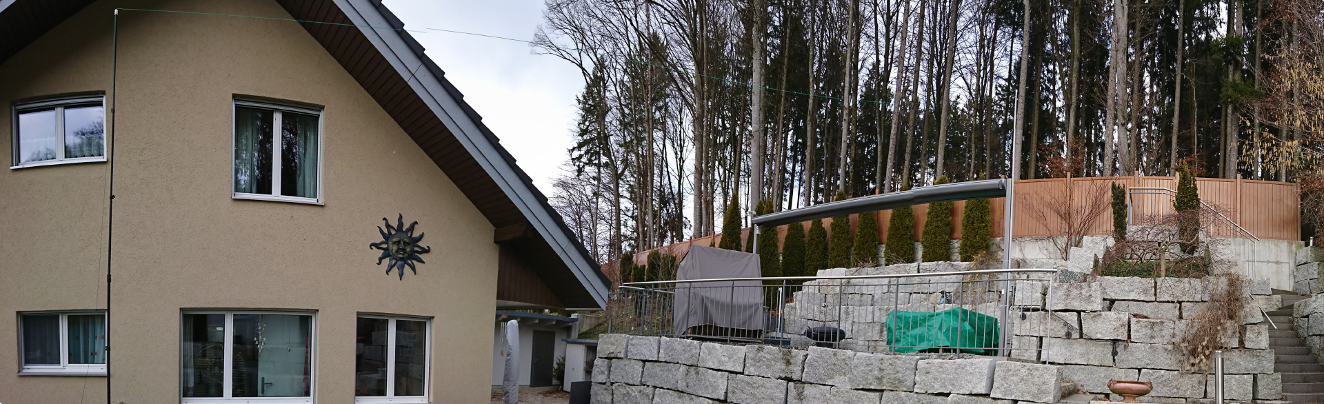 Auf dem Fahnenmast befindet sich ein Duobbanddipol für das 2m- und 70cm- Band. Die Magnetic- Loop auf der Rasenfläche zwischen Thujahecke und Hausfassade wird für das 10- bis 40- Meterband eingesetzt. Für das 80- und 160- Meterband zieiht sich eine etwa 40 Meter lange, endgespeiste Drahtantenne (Grüner Draht) vom automatischen Antennentuner unterhalb des linken Unterdachs über einen ersten etw sechs Meter hohen Teleskopmast bei der Kellertreppe zu einem zweiten Teleskopmast rechts auf dem Gartensitzplatz und weiter zum Sichtschutz (Hinter dem Gartenhäuschen). Damit der Draht überhaupt sichtbar ist, musste das Bild überbelichtet werden.
