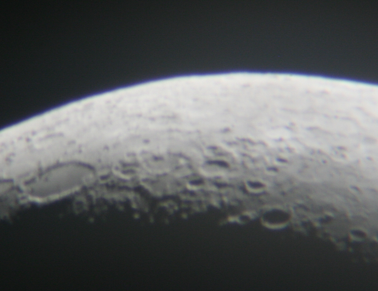 Minolta SRT-101 am Celestron CR 150/f8; Okularprojektion mit 15mm Okular; 400- ASA Farbnegativfilm; 1/15s; eingescannt und im Irfanview Ausschnitt erstellt: man beachte den blauen Farbsaum über der Mondkante, der durch den sekundären Farbfehler der achromatischen Optik entsteht.