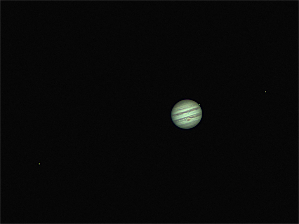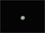 Das Seeing war infolge starken Föhns katastrophal. Dazu waren Schleierwolken allgegenwärtig. Das Abbild des Planeten schwabbelte und hüpfte sehr stark im Gesichtsfeld herum. Entstanden ist dieses Bild mit einer TIS DFK 31 fokal am Lichtenknecker HA150/f15. 3000 Bilder sind mit Registax 6 bearbeitet worden. Die drei sichtbaren Galileischen Monde sind von links oben gegen rechts: Kallisto, Io und Ganymed.