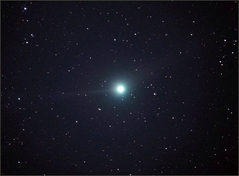 Lulin nahm gegen Ende vom Fenruar 2009 seine erdnäheste Stelle ein und war bei sehr dunklem und klarem Himmel von blossem Auge sichtbar. Bereits in einem Feldstecher zeigte er sich als nebliger Fleck. "Lulins" Bahn am Himmel liegt sehr nahe an der Ekliptik, was sehr selten vorkommt. Ab Ende Dezember 2008 war er kurz vor Sonnenaufgang, sehr tief am östlichen Horizont im Sternbild "Skorpion" das erste Mal zu beobachten. Rasch wanderte "Lulin" über die "Waage" zu "Jungfrau" und "Löwe", wo er Ende Februar auch seinen erdnächsten Punkt erreichte. Dann wurde die Entfernung zu Erde und Sonne rasch grösser und "Lulin" verblasste beim Passieren der Sternbilder "Krebs" und "Zwillinge" zusehends. Leider waren Wetter und dann die Mondstellung oder beides immer wieder ungünstig, so dass es mir nicht gelang eine eigene Foto zu schiessen. Ich verwende deshalb ein Bild meines Sternefreunds Claudio Abächerli, der dieses am 27. Februar 2009 in der Sternwarte "Adler" auf dem Simplonpass mit seiner unmodifizierten Canon 350D und einem 210mm Teleobjektiv gelang. Der helle Stern ist Regulus, der Hauptstern des Sternbildes "Löwe". Die Kamera war auf dem dortigen Takahashi befestigt. Die Daten: 800 ISO, f6.3 Belichtungszeit 350s. Danke Claudio.