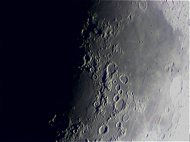 Dem Mare Nectaris (leicht rechts oberhalb der Bildmitte), grenzt unmittelbar links der auffällige Krater Thophilus an. Die vier Krater am rechten Bildrand befinden sich im Bereich des Mondschattens (Terminator) und heissen von oben nach unten: Langenus, Vendelinus, Petarinus und Furnerius. Aufnahme mit der TIS-DFK fokal am Meade ED 102/f9. 750 von 4000 Aufnahmen mit Registax 6 bearbeitet.
