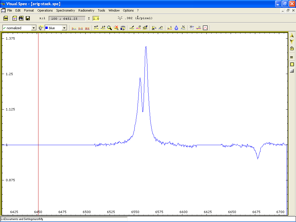Interessant ist das Betrachten des Doppelpeaks bei 6565 Angström (H-alpha- Bereich). Während sich beim oberen Spektrum der höhere Gipfel rechts befindet, ist er beim rund drei Jahre älteren Spektrum rechts. Es ist übrigens die Linie des Wasserstoffs (H- alpha), die sich hier "spaltet" - Warum?