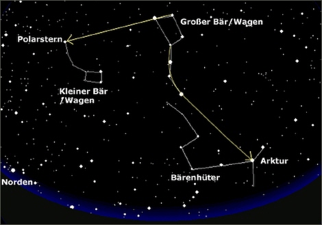 Der Haupstern des Sternbildes "Bärenhüter" befindet sich als roter Riesenstern in der Spektralklasse "K" und ist neben Sirius der hellste Stern am Nordhimmel. Finden kann man ihn sehr einfach, indem man den Bogen der Deichsel des "Grossen Wagen" schwungvoll erweitert. Arkturs Leuchtkraft beträgt mehr als das 100-fache unserer Sonne. Er strahlt aber den grössten Teil seiner Leuchtkraft im - für das menschliche Auge unsichtbaren - Infrarotbereich ab. Zusammen mit Spica (Jungfrau) und Regulus (Löwe) bildet Arktur das Frühlingsdreieck.