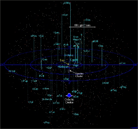 Vergrössern wir den Massstab weiter, bis die Umgebung unserer Sonne im Umkreis von 250 Lichtjahren überschaut werden kann. Vor allem leerer Raum liegt zwischen unserem Sonnensystem und den uns am nähesten liegenden Sterne. Unsere Sonne befindet sich am Rand unserer Galaxie in einem der Spiralarme. |